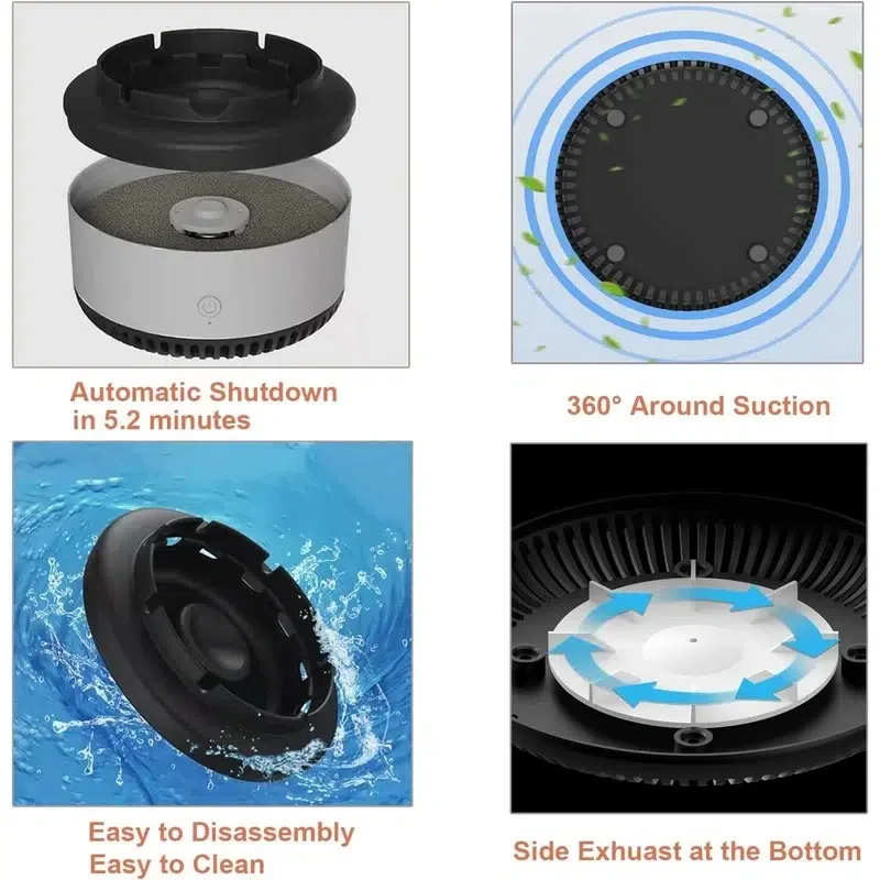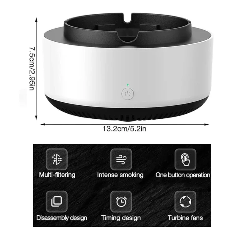 زیرسیگاری الکترونیکی تصفیه کننده هوا self-extinguishing ashtray AS-08 با چهار جا برای قرار دادن سیگار میتواند دود سیگار را جذب کند و بو را ازبین ببرد. بوی بد سیگار، تحریک پذیری و اختلاف نظر درباره سیگار میتواند باعث تنش بین اعضای خانواده شود. این زیر سیگاری هوشمند با وزن سبک و طراحی دایره ای شکل مدرن در بخش انتهایی با تعدادی شیار بصورت 360 درجه طراحی شده که سیگار را از هر قسمتی قرار دهید، به خوبی میتواند دود را حذف کند. گردش باد 360 درجه تصفیه هوا را تسریع میکند. هوای تازه را از پایین از طریق فیلتر کامپوزیت بازدم میکند. با فیلتر های معطر محیط بوی خوبی میگیرد. برای استفاده از قابلیت حذف دود تنها کافیست دکمه پاور تعبیه شده بر روی آن را لمس نمایید. با صدای کم و مکش قوی از مواد سخت مقاوم در برابر شعله ساخته شده است. قسمت بالایی این محصول قابل شستشو بوده و محصول با استفاده از باتری انرژِی لازم را برای تصفیه هوا کسب می نماید. با هر بار تعویض باتری، تا 40 بار سیگار کشیدن را پوشش میدهد. مدل AS-08 انتخابی عالی برای حذف دود سیگار در فضای بسته است و این دستگاه فقط یه زیرسیگاری نیست، محافظ هوای اطرافتان هم هست. کارایی این محصول در کنار زیبایی آن را به همراهی روزانه در خانه، خودرو یا محل کار تبدیل کرده است.